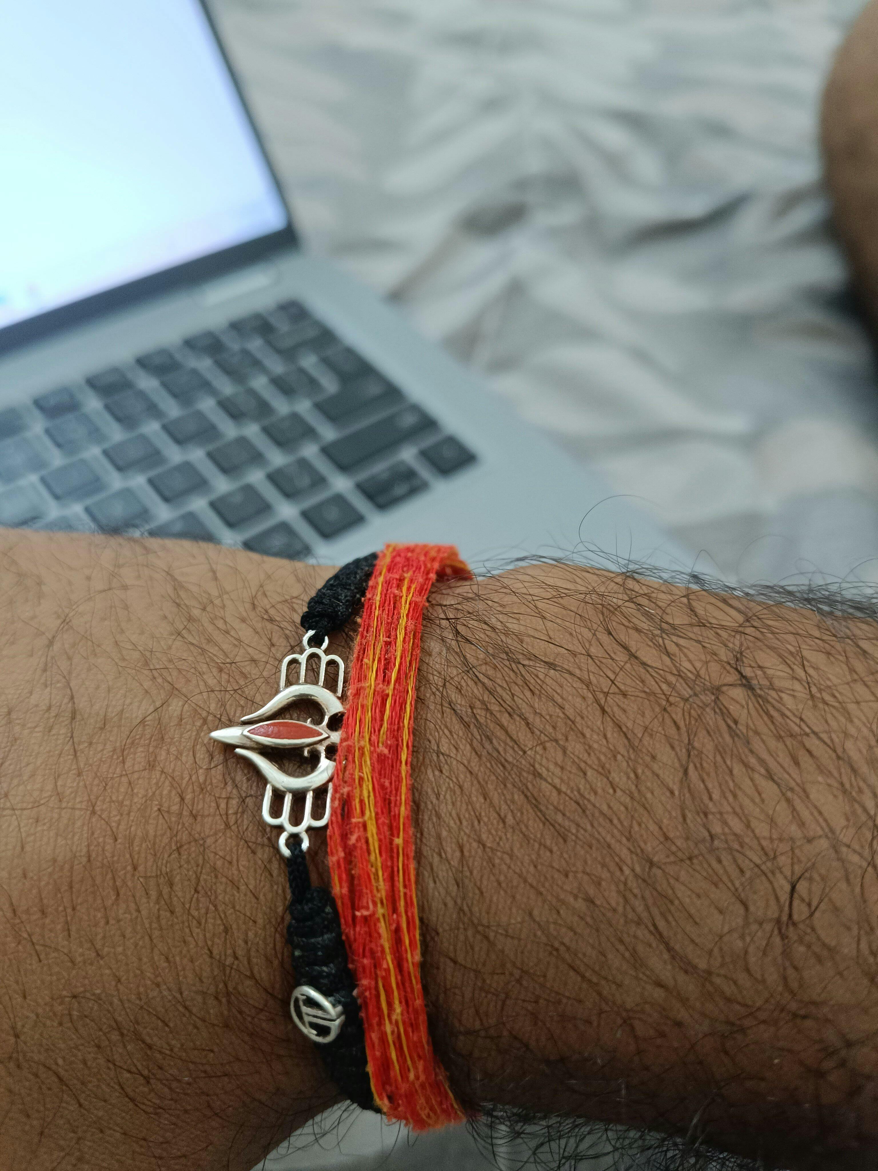 Surrounding the Trishul are intricate designs resembling Lord Shiva’s Tikka, further enhancing its spiritual significance. This bracelet serves as a constant reminder of strength and divine guidance, perfect for those seeking a deeper connection to their spirituality.