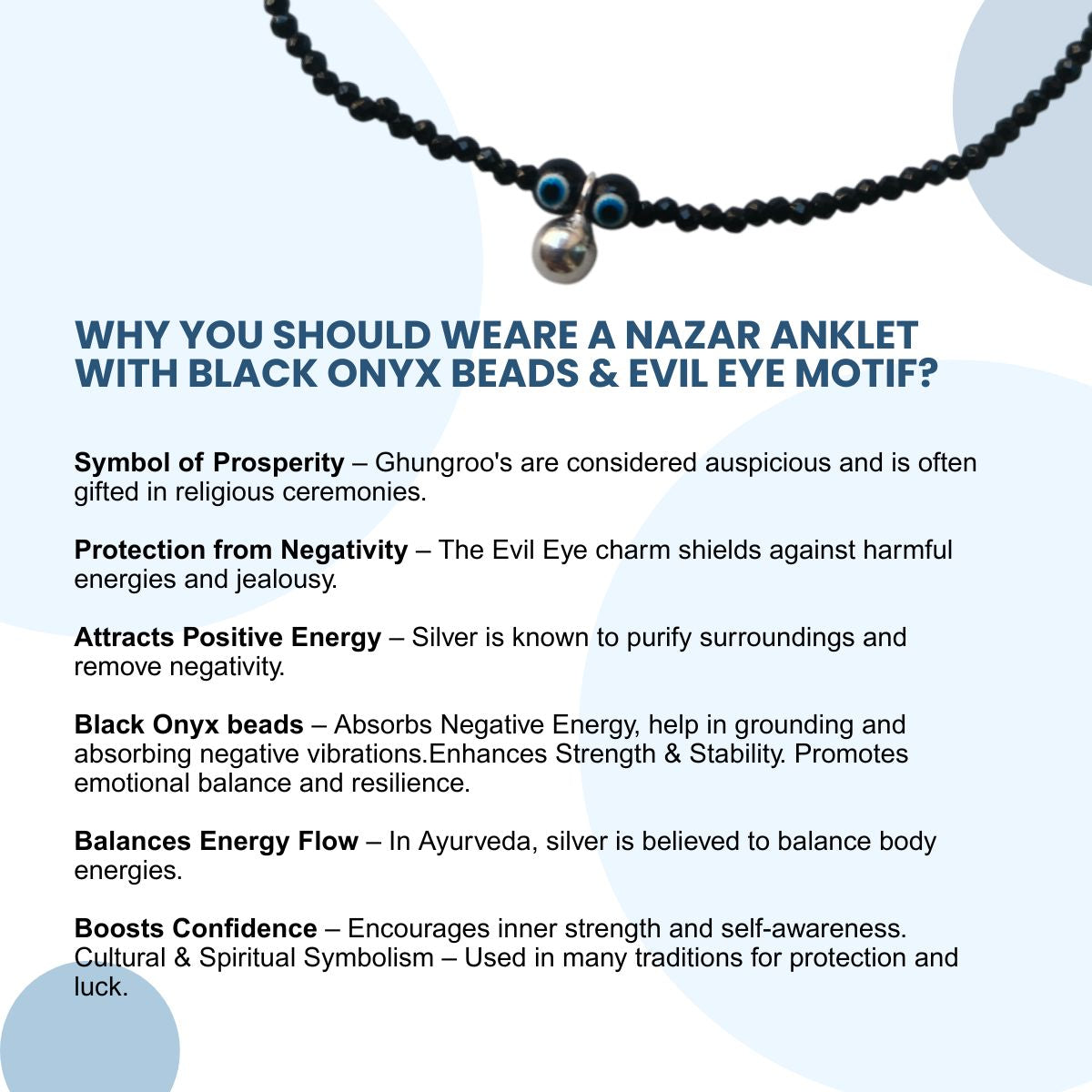 Step into a world of divine grace, protection, and prosperity with the Trivalya Delicate Ghungroo Anklet. Designed for those who appreciate subtle elegance with deep spiritual significance, this 92.5 sterling silver anklet features a beautifully crafted central silver ghungroo, symbolizing luck and new beginnings, flanked by two Evil Eye beads for protection and genuine Black Onyx beads for grounding energy.