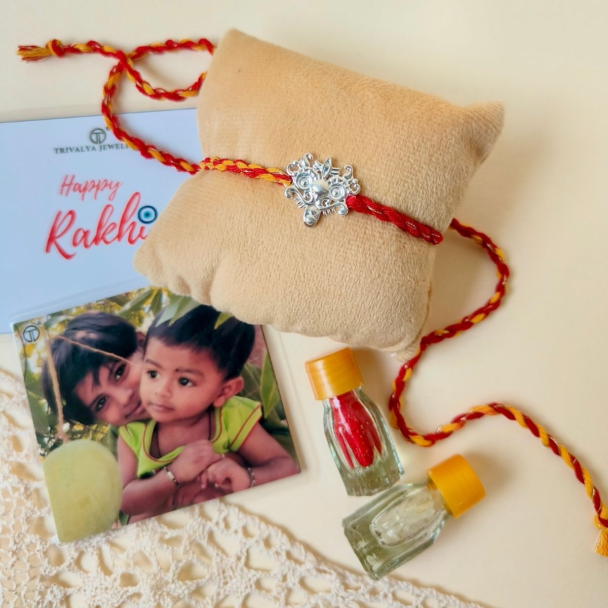 The Kirtimukh Rakhi is a sacred tribute to divine protection and spiritual guardianship. Handcrafted in 92.5 Pure Silver and tied with the traditional red moli, this rakhi features the fierce yet benevolent face of Kirtimukh — the celestial guardian often seen adorning temple entrances. Symbolizing the removal of negativity and the welcoming of auspiciousness, it offers your brother strength, blessings, and protection through every phase of life.
