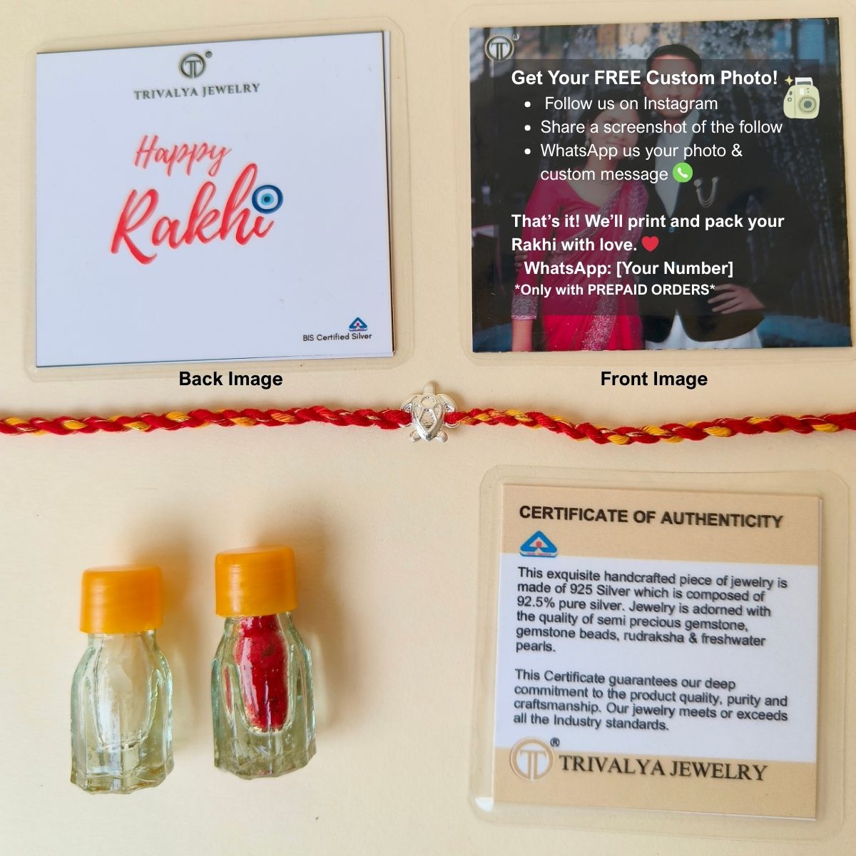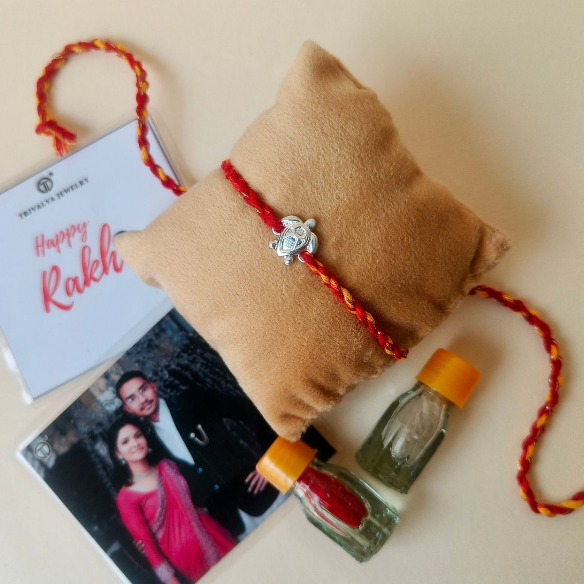 The Lucky Turtle Rakhi is a sacred token of protection, prosperity, and enduring love. Handcrafted in 92.5 Pure Silver and tied with a traditional red moli, this rakhi features the revered turtle — a timeless symbol in Hindu scriptures representing stability, wisdom, and long life. Just like the turtle carries the world on its back, let your bond carry strength, blessings, and divine grace.